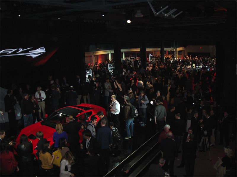 Media days at the 2013 NAIAS started Monday, January 14th. Chevrolet staged a private showing for the new Corvette, a “reveal” in Chevy speak, the previous evening at the Russell Industrial Center a few miles from NAIAS’s Cobo Hall. WIth journalists in from all over the world, the logistics were perfect. But it took more than media credentials to gain admission. I don’t know Chevrolet’s criteria, but was told this was one tough invite with requests double the space available. Four-hundred enthusiasts bought their way in through a National Corvette Museum fund raiser at a cool $999 each. Counting rows, I ball parked the attendance at about 1,000 seated and another 500 standing. I overheard a conversation after the reveal that claimed the event was planned for 1,200, but 1,500 showed up and some GM employees were asked to leave to make room. Secondhand, but that did square with my rough estimate.