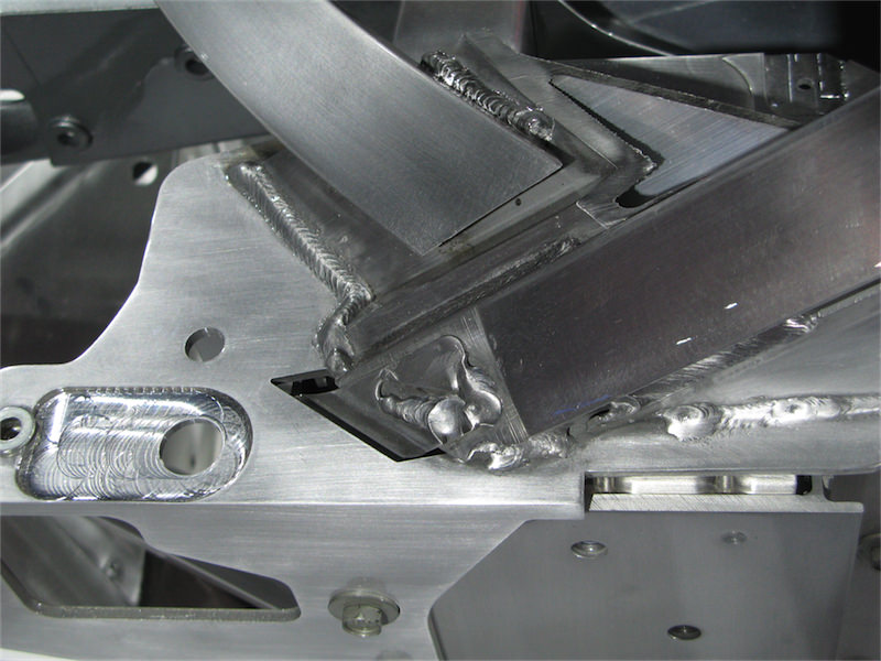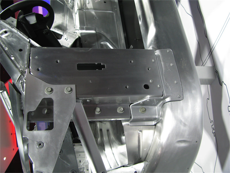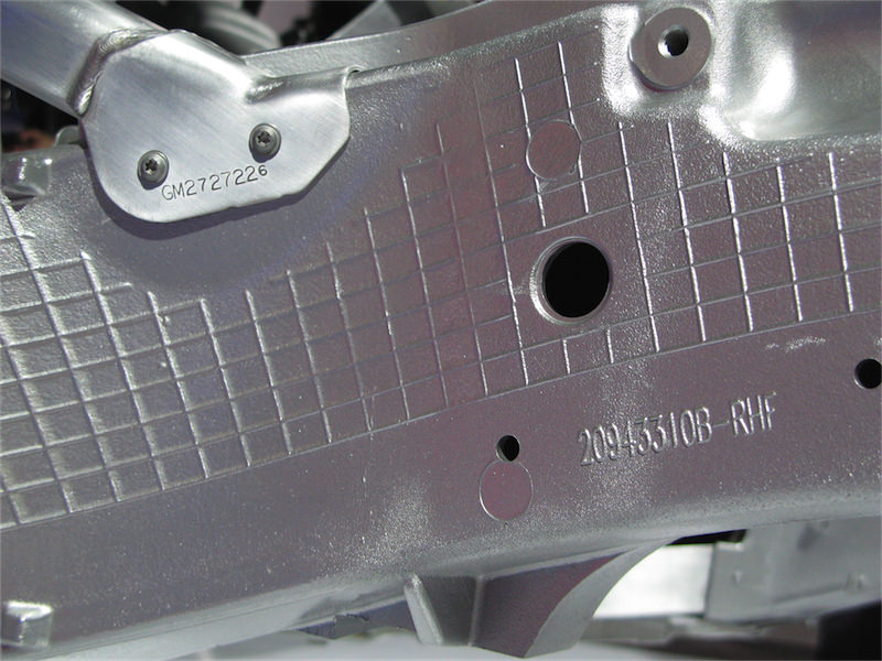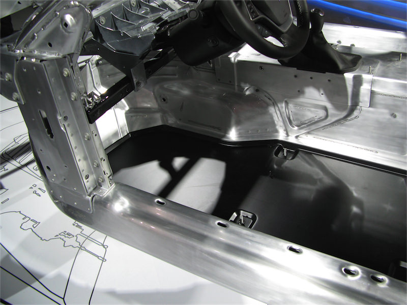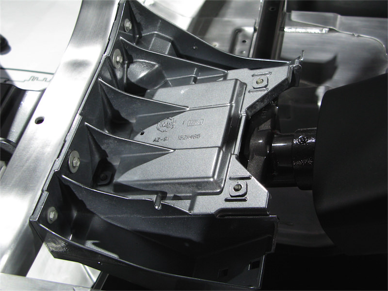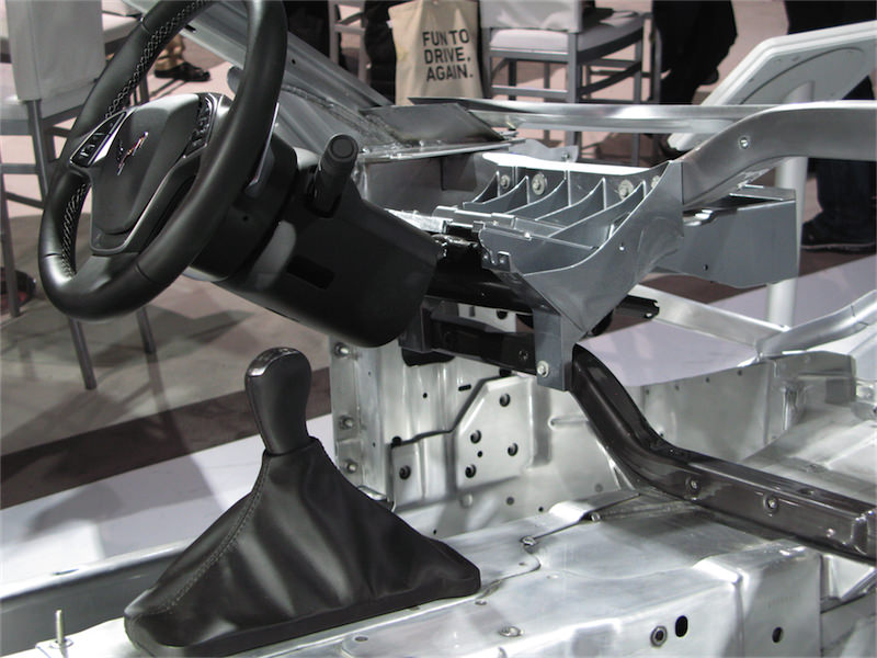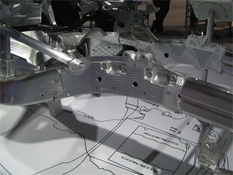 An aluminum frame will be included with all C7 Corvettes, unlike C6 when it was limited to Z06 and ZR1. But it does not replicate the C5-C6’s one-piece hydroformed side rail. The C7’s frame rail section is five pieces, welded or bolted together. Engineers told me the five-piece setup gave them more design flexibility, including using different gauges as needed. At first glance, it looks similar overall, yet it is totally rethought.