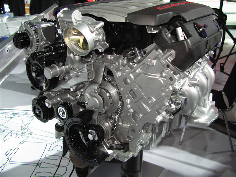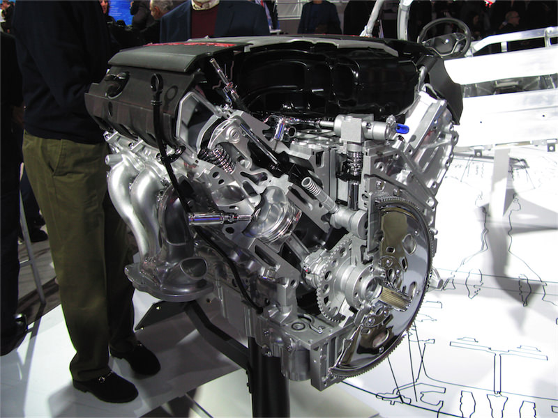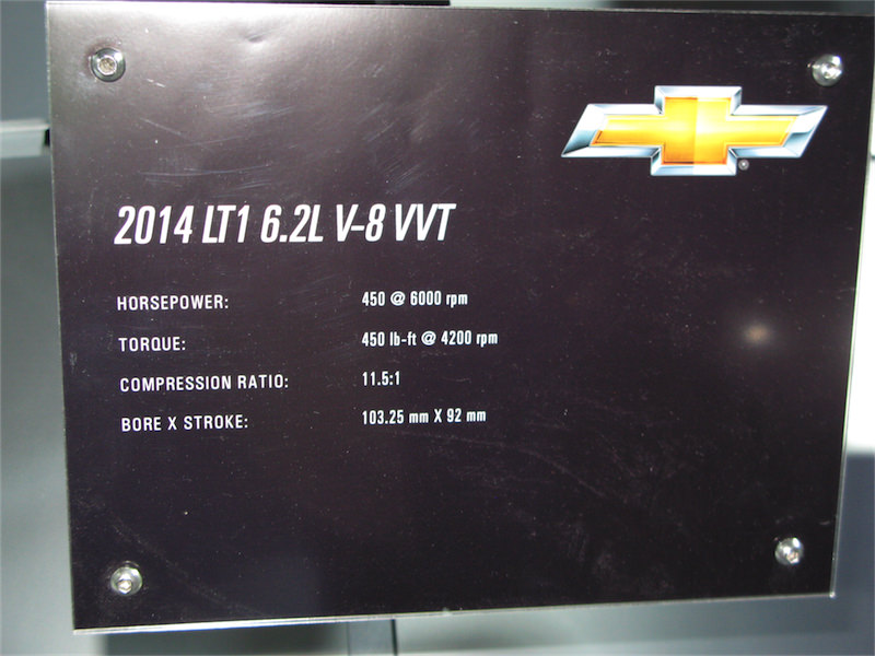 Details of the C7’s base engine, the aluminum block and head 6.2 liter (376-cid) LT1, were released several months earlier. It is the fifth generation refinement of the two-valve per cylinder V8 that base Corvettes have employed since 1955, but its power output, fuel economy and emissions are sure to be world-class. Exact ratings aren’t locked in, but expect the new engine to reach 450 hp and 450 lb-ft torque, sufficient for sub 4-second 0-60 mph times. With direct injection, variable valve timing, and cylinder deactivation, fuel economy should be stellar.