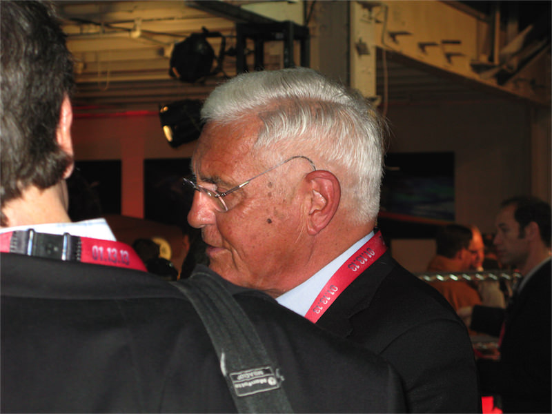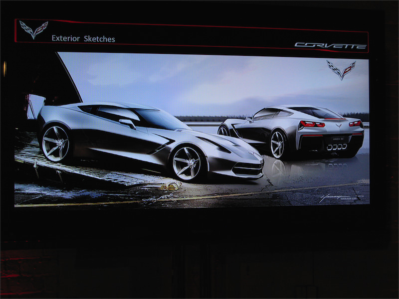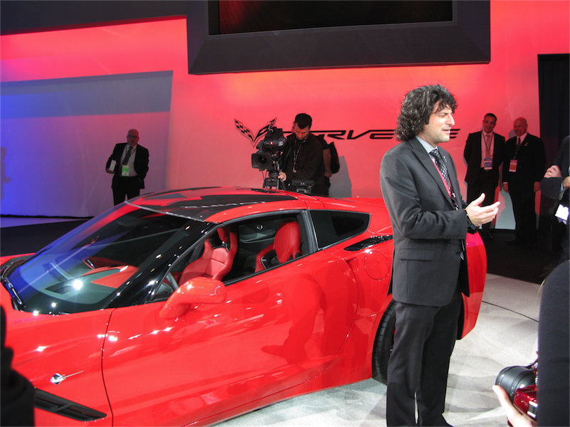 Admission to the reveal started at 6:00PM. A loop of film ran on a big screen showing classic Corvette movies and photos, everything from Duntov in the fifties to the latest C6-R racing footage. It also included clips of Tadge Juechter, Corvette’s current Chief Engineer, and Ed Welburn, GM’s Vice President of Global Design. Each talked about the new car, its development and special features. Both men came across extremely well, also the case in person. At 7:00PM, the “press conference” began, handled by Mark Ruess, GM’s North American president. A covered car on stage was actually a light-show prop used to demonstrate designers’ attention to airflow around, over and through the 2014 model. Eventually a Torch Red 2014 coupe rolled onto the stage. Well received is understating it. This was an enthusiast crowd, many of whom had Corvette linkage beyond mere media curiosity.